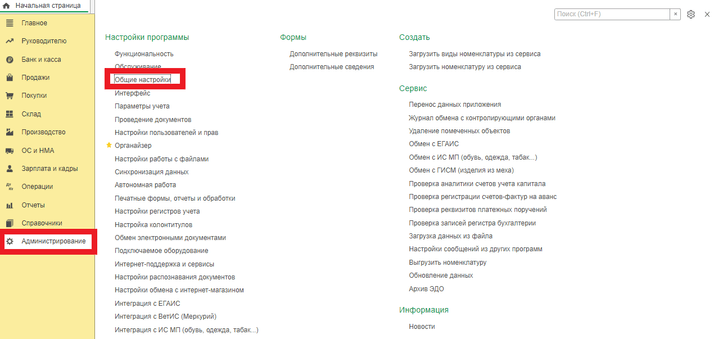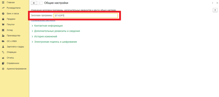 Перейти в раздел «Администрирование», выбрать в списке «Общие настройки». В открывшемся окне по строке «Заголовок программы» сделайте изменения наименования. После закройте «Общие настройки», так произойдет сохранение изменений. Заголовок сверху в шапке будет изменен.