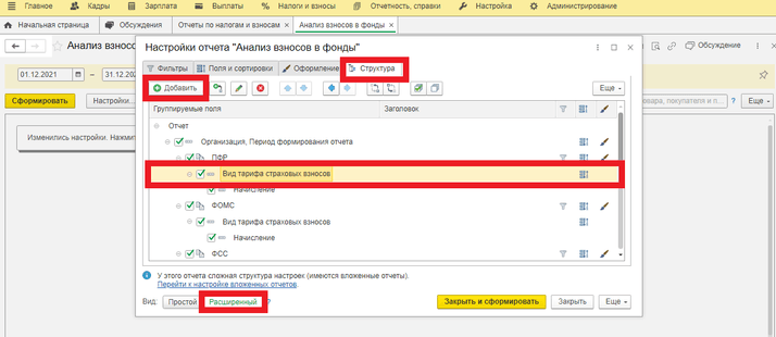 Сначала перейдем в сам отчет, раздел «Налоги и взносы» - «Отчеты по налогам и взносам», в открывшемся окне выберем отчет «Анализ взносов в фонды». Далее перед тем, как сформировать отчет, нажмем на кнопку «Настройки», снизу «Вид» - «Расширенный» и перейдем во вкладку «Структура». На данной вкладке в группировке по ПФР, ФОМС, ФСС выделяем пункт «Вид тарифа страховых взносов» и нажимаем кнопку «Добавить», в открывшемся списке выбираем «Сотрудник» двойным щелчком мыши.