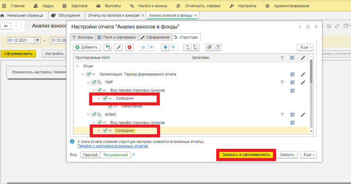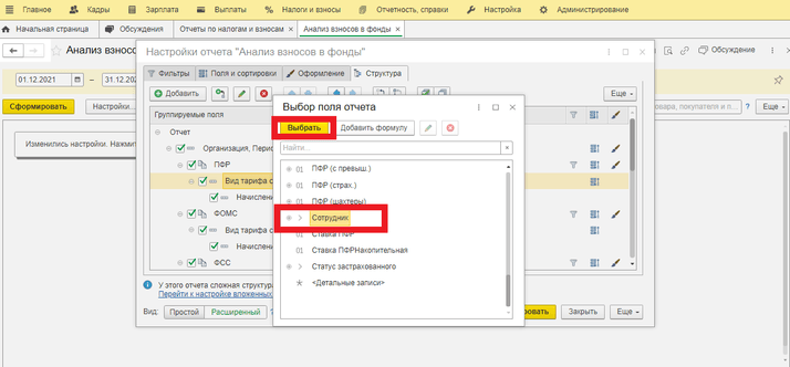 Для того чтобы в отчете «Анализ взносов в фонды» была информация в разрезе сотрудников необходимо настроить отчет следующим образом.