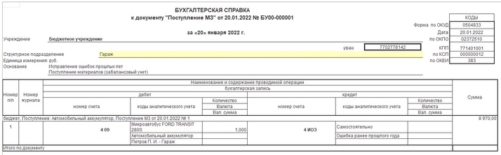 | Исправлена ошибка прошлых лет на забалансовом счёте 09 | 4.09 | 4.ИОЗ | 8970,00 | Поступление МЗ | Бухгалтерская справка (ф. 0504833)