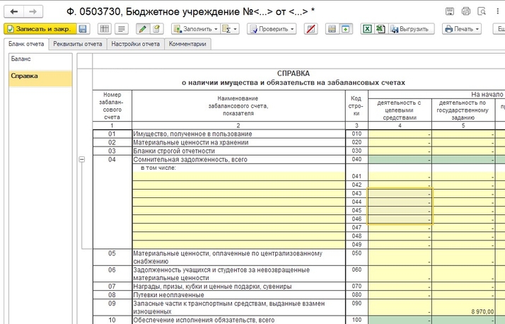Данные по забалансовым счетам формируют показатели справки к балансу (ф. 0503730) и иных форм, например раздела 3 сведений о движении нефинансовых активов (ф. 0503768). Информация об исправленной ошибке отражается путём включения показателя на соответствующем забалансовом счёте в колонку «На начало года». Сведения об исправлении ошибки на забалансовом счёте могут быть включены в текстовую часть пояснительной записки (ф. 0503760).