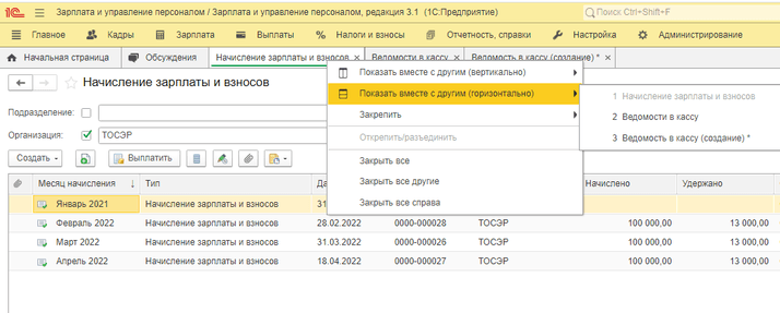 Для того, чтобы в 1С:Зарплата и управление персоналом, ред. 3.1 показать на экране одновременно два документа, необходимо установить курсор на окно документа или отчета на панели открытых документов, нажать правой клавишей мыши и выбрать в списке «Показать вместе с другим». Отобразить два документа можно вертикально или горизонтально.