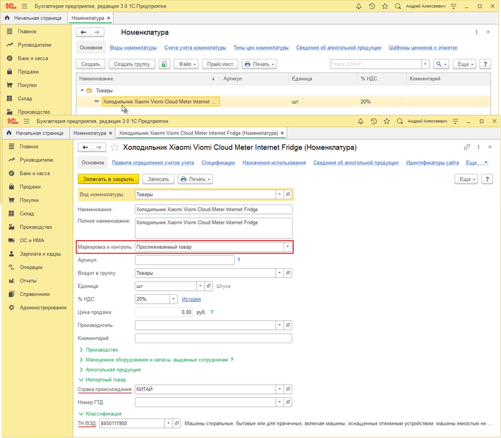 В программе 1С: Бухгалтерия предприятия, ред. 3.0 в разделе «Справочники» – «Номенклатура» открываем карточку товара, который подлежит прослеживаемости. В поле «Маркировка и контроль» выбираем «Прослеживаемый товар». В блоке «Импортный товар» указываем страну происхождения, в блоке «Классификация» - код товарной номенклатуры внешнеэкономической деятельности Евразийского экономического союза (ТН ВЭД) - «Записать и закрыть».