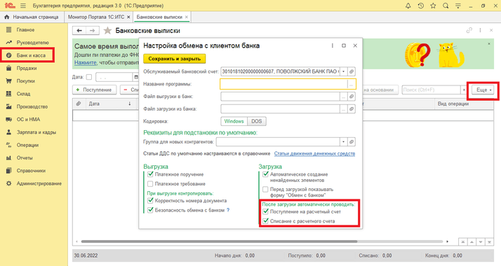 В открывшемся окне «Настройка обмена с клиентом банка» в блоках «Выгрузка» и «Загрузка» установить или снять флажки по параметрам выгрузки и загрузки (например, чтобы включить автоматическое проведение банковской выписки после загрузки поставьте флажки «Поступление на расчетный счет» и «Списание с расчетного счета» в блоке «После загрузки автоматически проводить»).