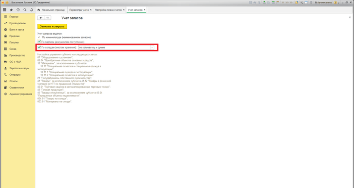 После данной настройки в плане счетов будет отображаться субконто «Склады» у счетов 08, 10, 41, и 43.